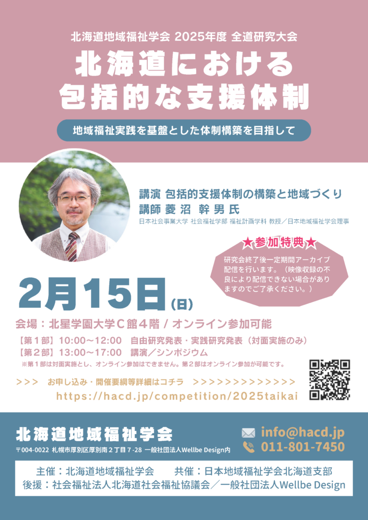 当学会では昨年度に引き続き、「地域の多様な主体による包括的な支援体制の構築」を本年度の研究テーマに掲げ、北海道における「包括的な支援体制」や「重層的支援体制整備事業」の構築に向けた課題やあり方についての探求を深めており、この度の研究会を開催する運びとなりました