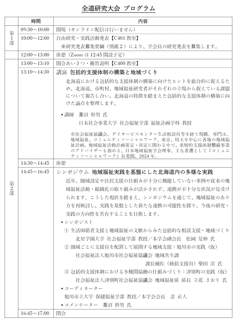 本年度の大会では「地域福祉実践を基盤とした体制構築」に重点に置き、北海道における「包括的な支援体制」や「重層的支援体制整備事業」の構築に向けた課題やあり方について研究討議いたします。
